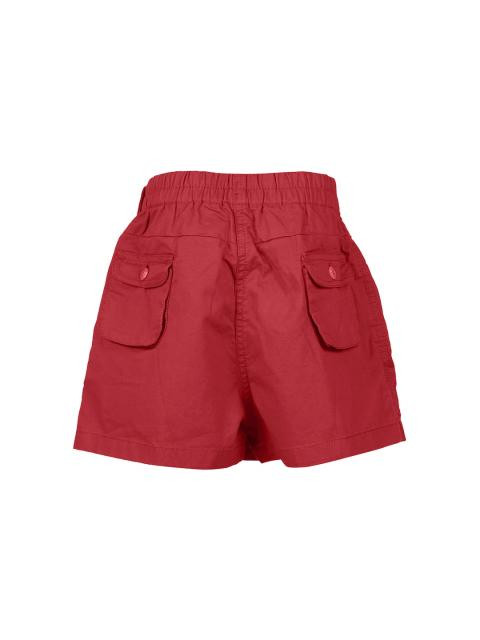 Red skort made of 100% cotton, has an elasticated waistband, two patch pockets on the back, a zipper fly, and brand name embroidered above the left hem in silver