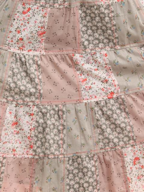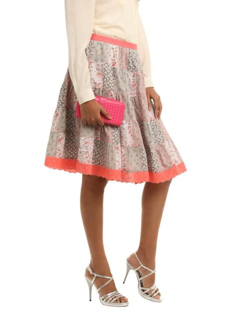 Patchwork skirt with floral printed panels and pink top stitch, pink waistband and lace detail at hem, concealed zipper and button closure on left, inner lining