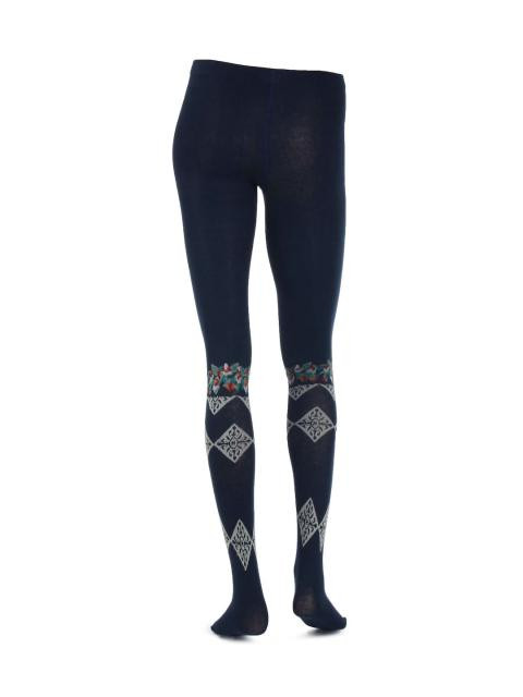 Opaque blue leggings made of a stretchable polyester cotton blended fabric, with soft elastic waist, loops to insert the foot and designs