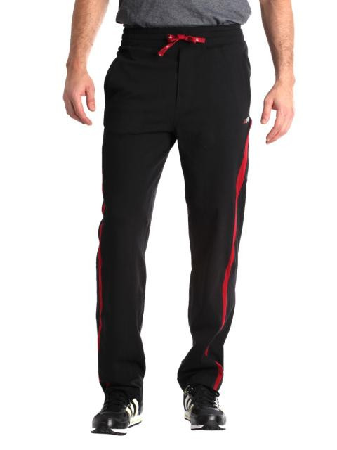 Black track pants made of 100% cotton, handy side pockets, comfortable elastic waistband with inner drawstring, brand name and logo embroidered on the left leg and red panel from the pocket to the hem on the sides