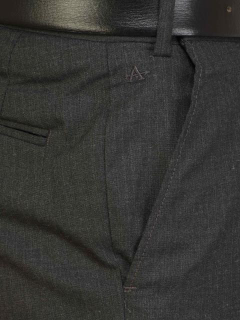 Charcoal grey formal trousers made of 64% polyester, 34% viscose and 2% lycra, has a flat front with two pockets on the sides, two welt pockets on the back with button closures, brand badge at the side of the right pocket, loops on the waist, reinforced stitch detailing along the crotch area, and a zipper and button closure