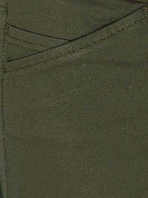Dark olive green pair of trousers with a button and zipped closure, loops for a belt around the waistband and a brand patch at the back of your waistband, two patch pockets at the back, two insert pockets in front with a diagonal opening and a small coin pocket within the right pocket