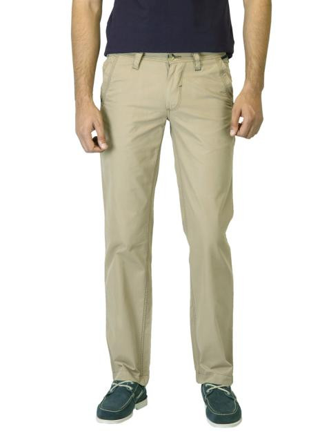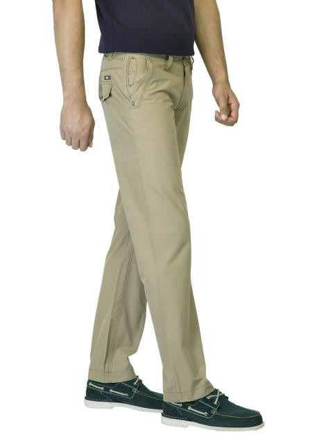 Khaki trousers made of 100% cotton, has a flat front, two pockets on the sides, two welt pockets on the back with buttoned closures, one small coin pocket on the right, belt loops on waistband, applique brand tab on the right hip pocket, stitch detailing and a button and zipper closure