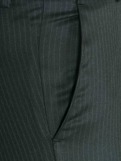 Black striped trousers made of polyester viscose blended fabric, has a flat front, two side pockets, two back pockets with loop and button closures, comfortable waistband with belt loops and a zipper and button closure