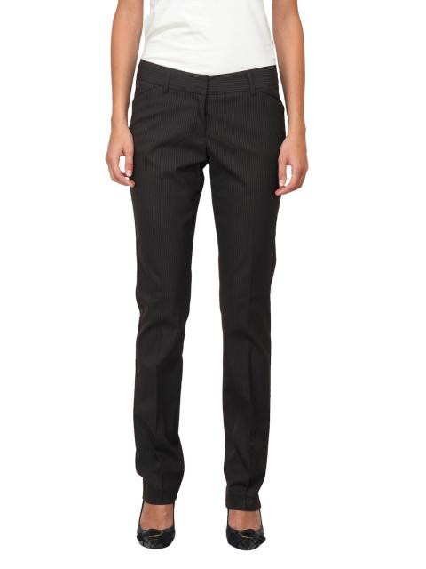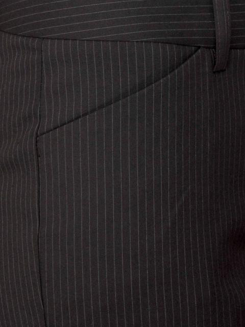 Dark brown striped trouser, has a zipper and button closure, belt loops on the waistband, two buttoned insert pockets at the back and two pockets on the front