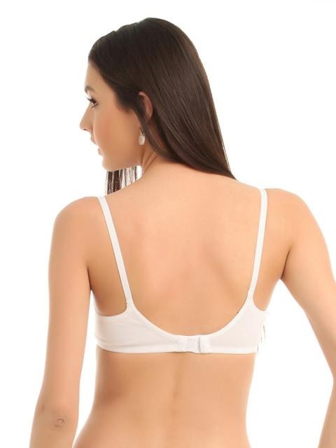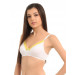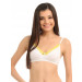 White bra with adjustable shoulder straps, yellow lace trims above the full coverage cups, hook back closure