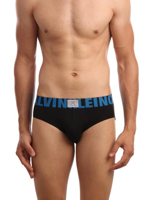 Black hip brief, has a soft elasticated waistband with branding on it, Calvin Klein X brand patch in front on the waistband, body defining Fit, cotton modal stretch for comfort and shape retention and a double layered pouch for enhanced comfort