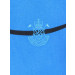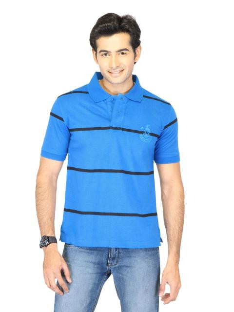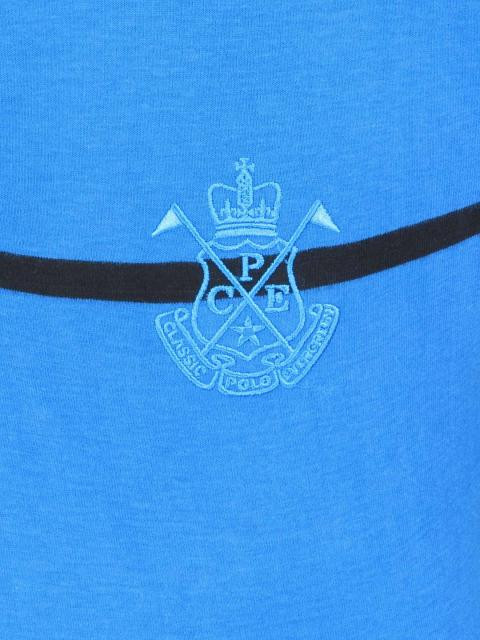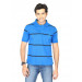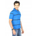 Blue polo neck t-shirt with black stripes, made of 100% cotton, has a ribbed and tipped collar with a velvetty tape inseam, buttoned chest placket, short sleeves with ribbed hems, vented hem with velvetty tape inseam and embroidered brand logo on left chest