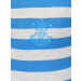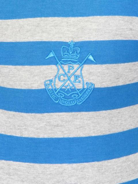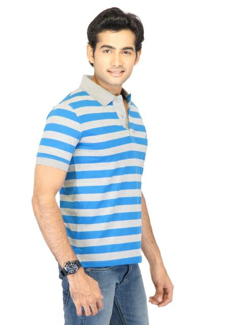 Grey and blue striped polo neck t-shirt, made of 100% cotton, has a ribbed and tipped collar with a velvetty tape inseam, buttoned chest placket, short sleeves with ribbed hems, vented hem with velvetty tape inseam and embroidered brand logo on left chest