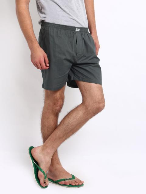 Grey woven boxers, elasticated waistband with brand patch on front, concealed buttoned fly, buttoned patch pocket at the back