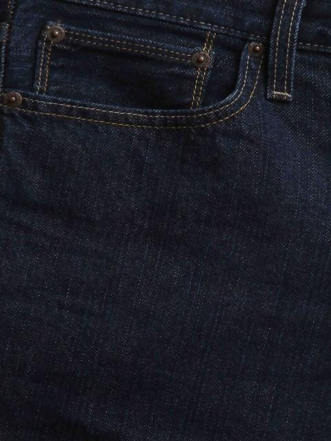 Dark blue jeans, has a buttoned and zippered closure, belt loops at the waist, brand patch at the back on the waist, two insert pockets in front with a coin pocket in the right insert pocket and two patch pockets at the back with embroidered brand logo on one. Our stylist has paired this with a blue belt in the picture.