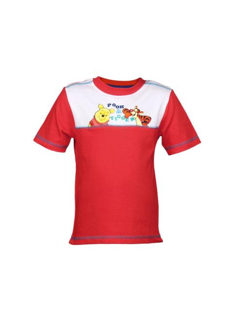 Red t-shirt in 100% cotton with Winnie the Pooh and Tigger print on white upper panel and blue stitch detailing along sleeve and shirt hems