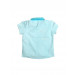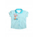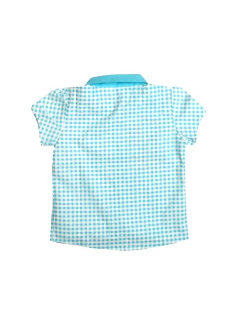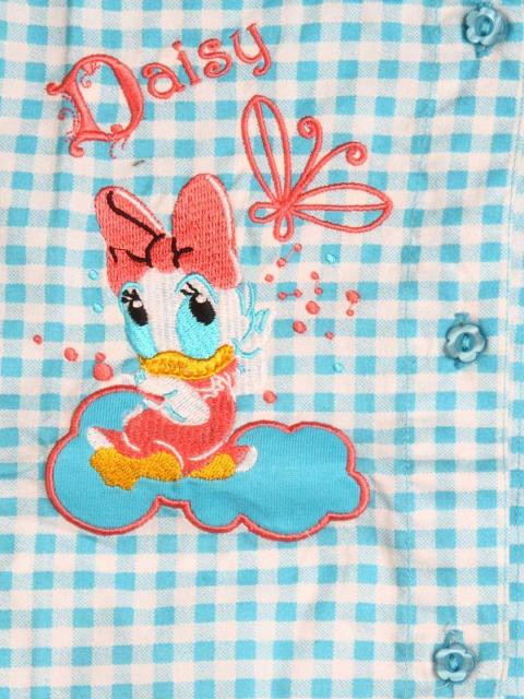 Blue checked shirt has a peter pan collar, a button placket, short puffed sleeves and Daisy embroidery detailing on the front, with slightly curved hemline
