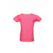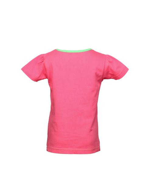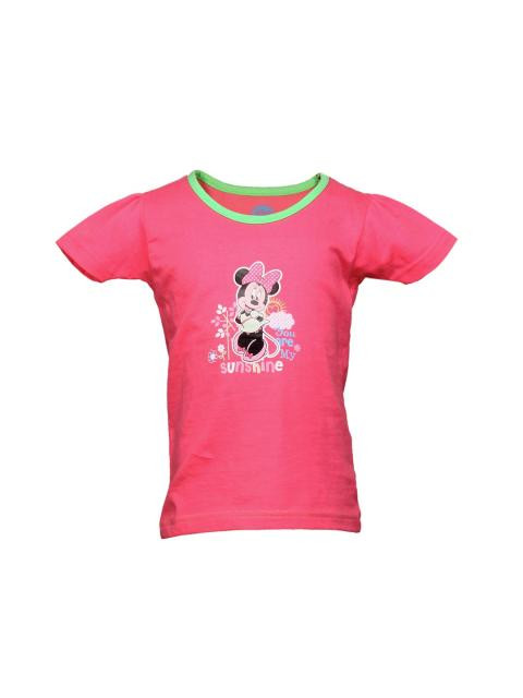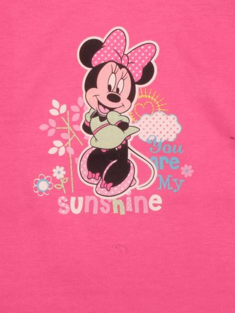 Pink round neck t-shirt made of 100% cotton with slight puff on sleeves, green piping around neckline, and Minnie Mouse graphic on the front