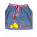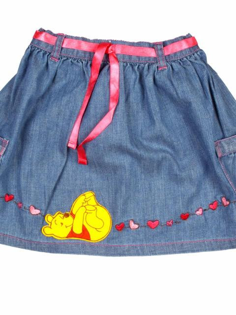 Blue denim skirt made of 100% cotton with elastic waist band, red ribbon belt and bow, pockets on the sides, pink heart embroidery and applique of Pooh