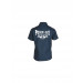 Navy blue shirt made of 100% cotton, with short sleeves and fold over hems, tipped collar with a checked tape inseam, front buttoned placket with checked inner lining, pocket on left chest with checked lining, and has graphic print on the right chest and back