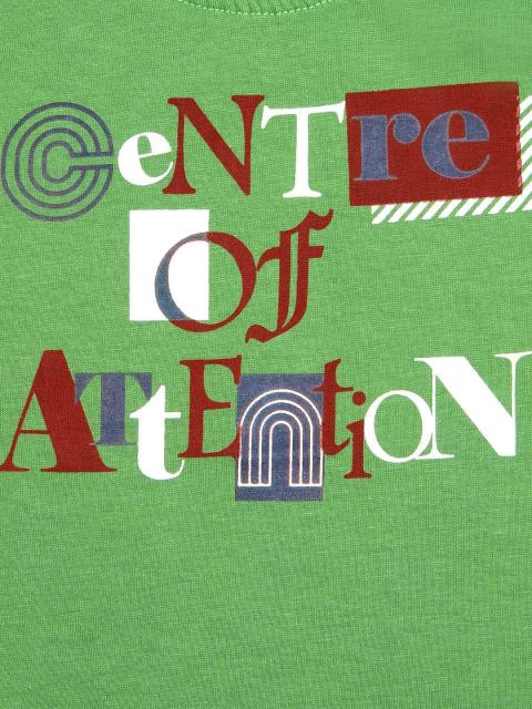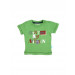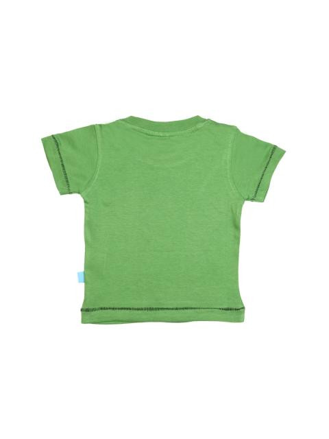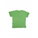 Green round neck t-shirt made of 100% cotton, with short sleeves, has a ribbed neckline with a fabric tape inseam, stitch detailing on the sleeve and shirt hems, brand collection badge on left waist, and has graphic print on the front