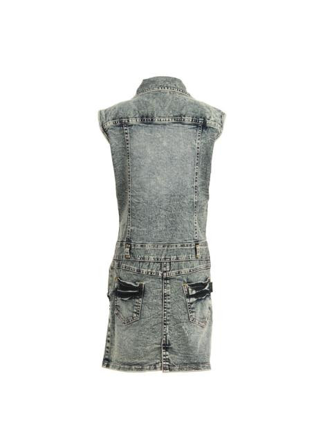 Denim stone washed sleeveless dress, has a cutaway collar with a half buttoned placket, mock patch pockets with flaps on the chest, crumpled look at the edge of the collar and flaps of the mock patch pockets, back yoke, loops with a pink belt through it on the hip, two insert pockets in front below it with a coin pocket inside the right insert pocket, two patch pockets at the back under the belt with a crumpled look and a slit at the back in the centre