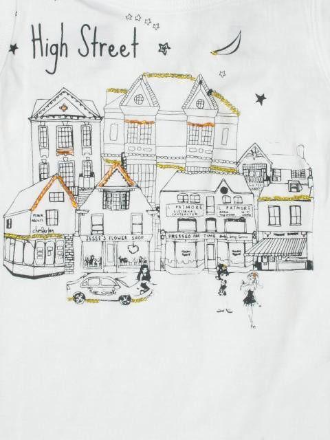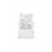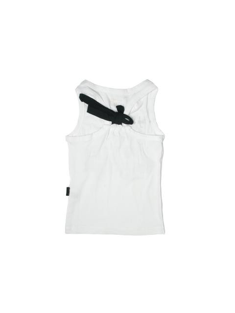 White sleeveless round neck top made of 100% cotton, has a racer back, graphic print and beading on the front and a bow detail on the back