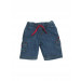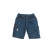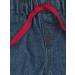 Blue denims that have an elasticated waist, two side pockets, two flaps at the back indicating a pocket with embroidery, two patch pockets on the sides with flaps, a drawstring on the waist and belt loops on the waist