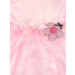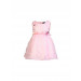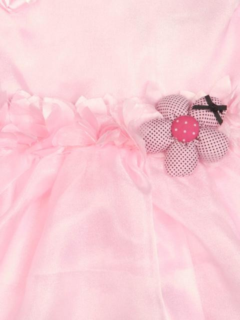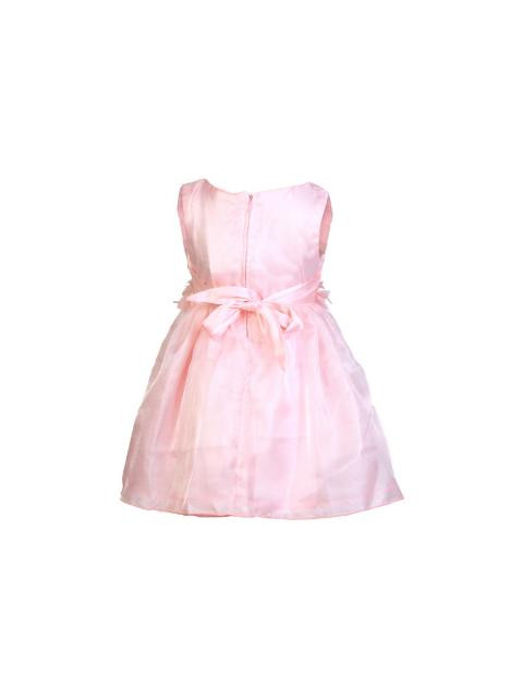 Pink sleeveless round neck frock made of A blended fabric, has mesh and cotton lining, has satin floral embellishment appliqued on the right shoulder, petal-shaped fabric embellishments around the waist, soft cushioned flower on the waist, a pink satin belt and a zipper at the back with a pink faux pearl necklace