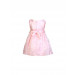 Pink sleeveless round neck frock made of A blended fabric, has mesh and cotton lining, has satin floral embellishment appliqued on the right shoulder, petal-shaped fabric embellishments around the waist, soft cushioned flower on the waist, a pink satin belt and a zipper at the back with a pink faux pearl necklace