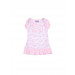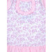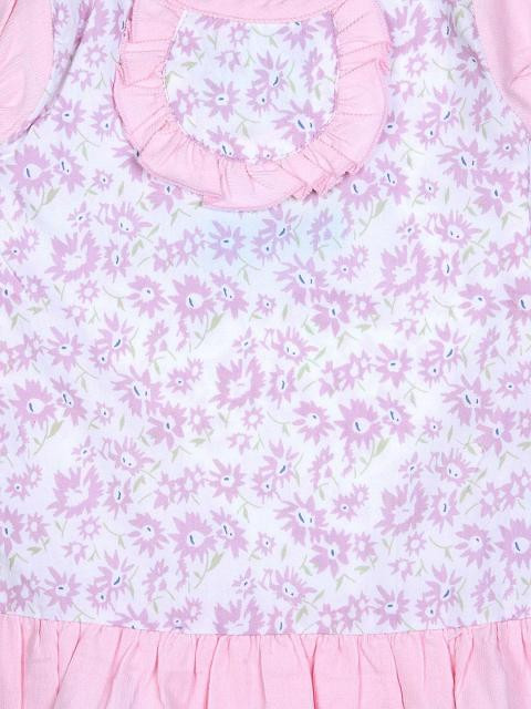 White frock with floral print, made of 100% cotton, has a round neck with pink piping, bib on the front with ruffled piping, short puff sleeves with elasticated hems and a pleated panel at the hem