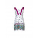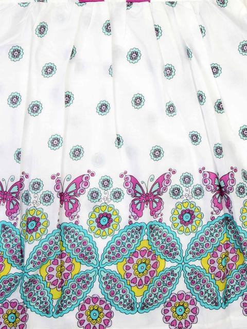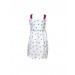 White printed dress made of 100% cotton, has elasticated soft shoulder straps extending onto the chest area and has mock buttons on the chest