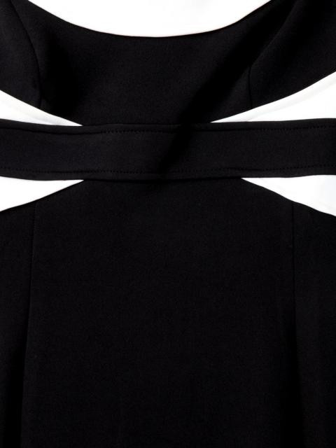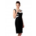 Black dress with white accents at the the U-neck and below the bust, has extended short sleeves, zipper at the back