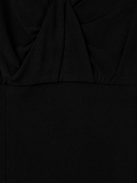 Black dress, knit, V neck, short sleeve, empire line with gather detail at the chest and attached lining