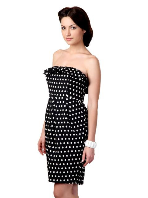 Black with off white polka dotted dress, bustier dress with detachable straps, frill at neck,with boning, empire line with pleats below chest, pegged silhouette with vent at back and concealed zipper with hook at the back