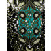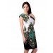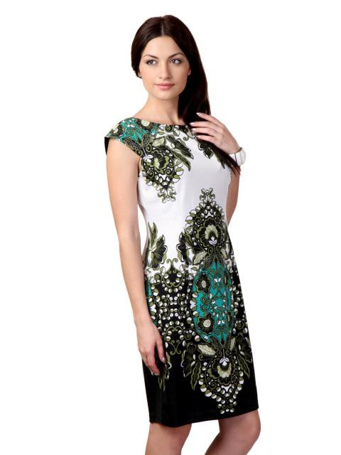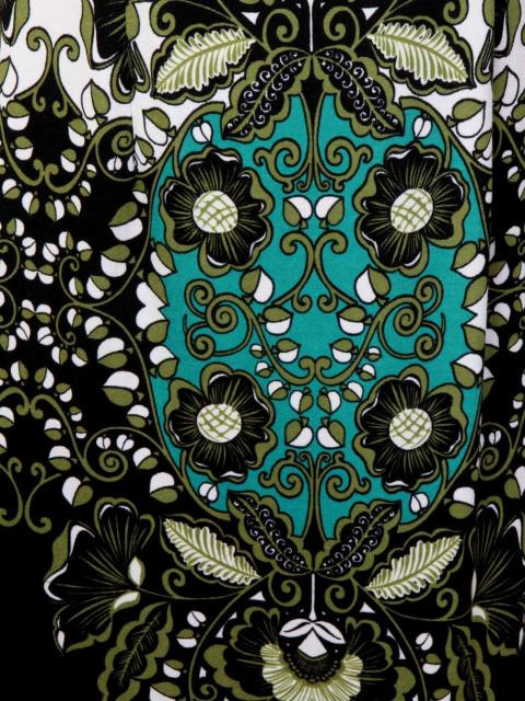Cream with olive, black and teal printed knit dress, boat neck, extended sleeves, princess panels and concealed zipper on the left
