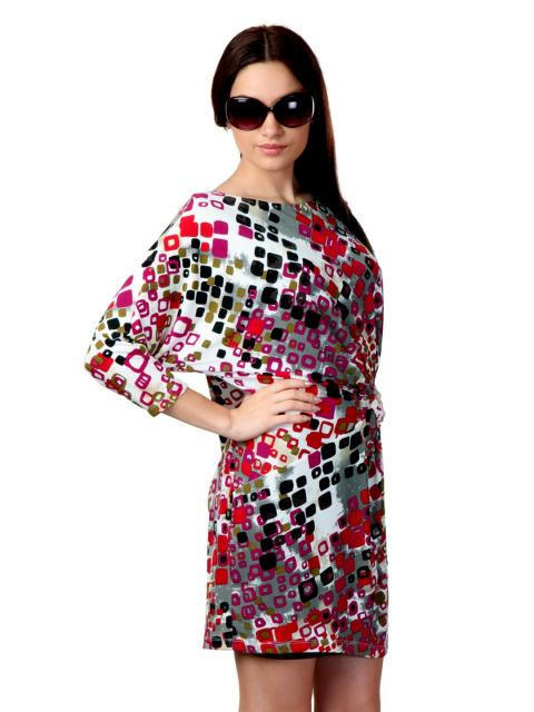Beige with purple, khaki, red and black geometric printed knit dress, boat neck, three quarter kimono sleeves, shift style, twist detail in front and attached lining