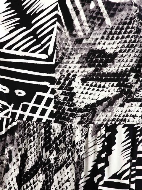 Black and white printed dress, has short sleeves, a cross-over neckline and an elasticated waist