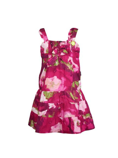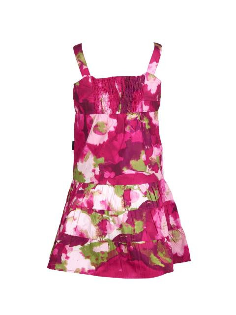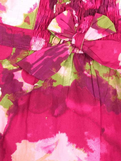 Pink printed strap dress, made of 100% cotton, has an elasticated and ruched panel on the front and back, empire waist with a bow and a flared tier at the hem