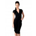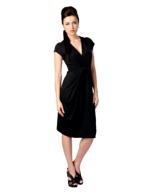 Black dress, knit, has a crossover V neckline, cap sleeves, bow detail below the bust and gathers on either side of the bow detail