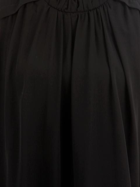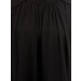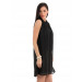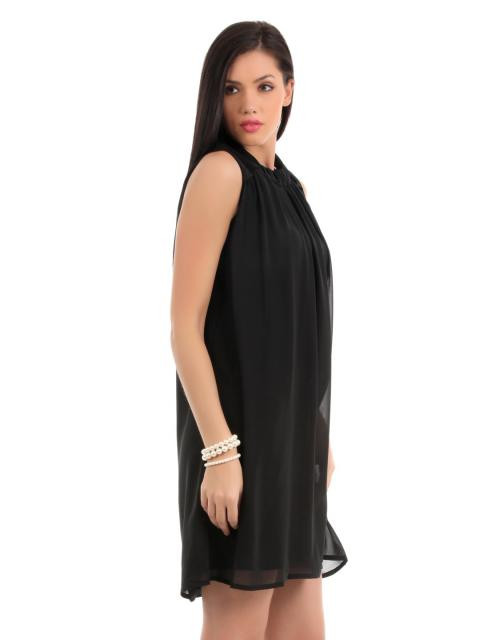 Black sleeveless dress with a round neck, gathers at the front, yoke at the shoulder, double buttoned keyhole detailing at the back below the neckline, has lining
