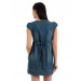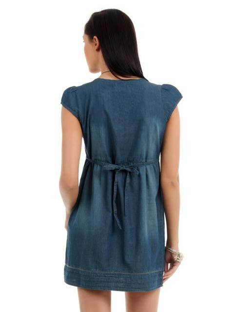 Blue denim dress, has a round neckline with a slit V neckline, half buttoned placket, embroidered, tiny ruffles and space  tuck detail on either side of the placket, cap sleeves, gathers from below the waist, sash tie at the back on the waist and horizontal tuck detail above the hemline