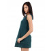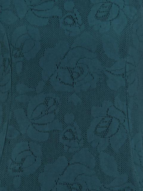 Teal knee length lace dress, round neck, sleeveless, princess panels, slip pockets incorporated into the princess panels in front, concealed zipper on the left, buttoned loop at the back, attached lining, crocheted lace at the hem