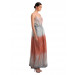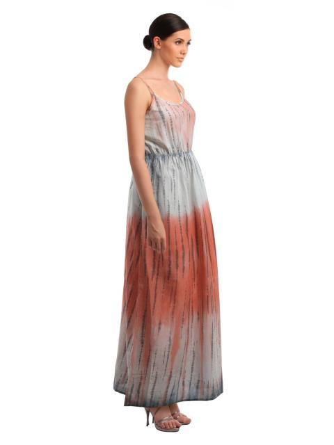 Grey and coral maxi-length dress with tie and dye inspired print in dark grey, woven, empire line with elasticated band below chest, thin shoulder straps, loops with tie-ups at the back