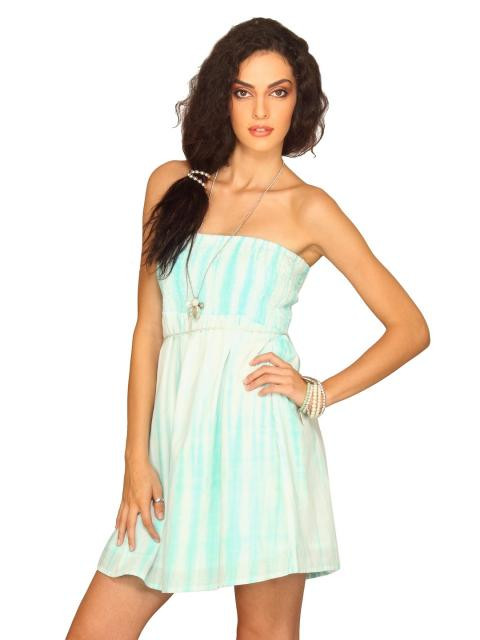 Get the vacation vibe going with this white tie-dyed dress from forever new. The simple tube dress with the smocked bodice and bold aqua green pattern is perfect for resort wear. Team this with flip flops and wooden bangles and get ready to soak in the sun.