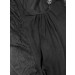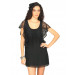 Black sleeveless flared tunic with black lining that has shell made of 100% silk, lining made of 100% polyester and waterfall lace panels over the arm holes made of 100% nylon, with a long zippered back
