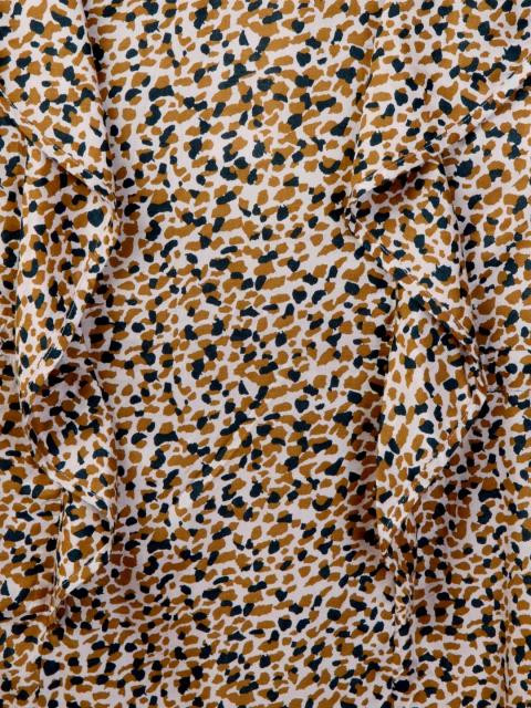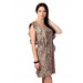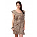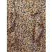Cream dress with ochre and teal print, scoop neck, sleeveless, princess panel with cascade inserts and drawstring with tie ups at waist on the side