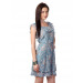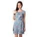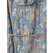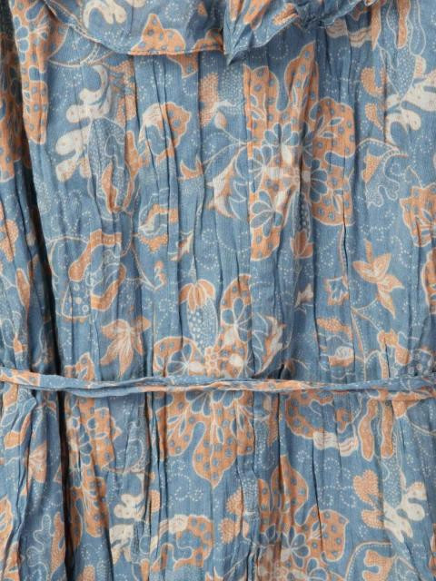 Blue sleeveless dress with floral print, has a round neckline with ruffles around it, fabric belt, open back with criss cross tie-ups