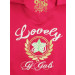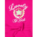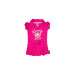 Fuchsia pink dress made of 100% cotton, has a spread collar, short puff sleeves, print on the chest, drawstrings for the midriff, and a pleated skirt