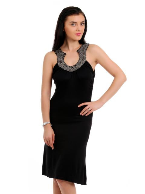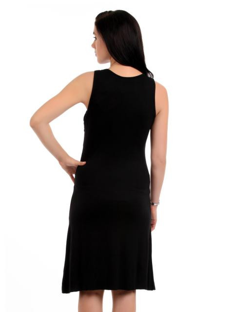 Black knit, sleeveless dress, has elasticated ruching below the arm holes and shaped neckline and beaded detail around the neckline