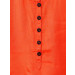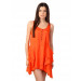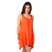 Orange sleeveless dress, round neck, five button placket, sequined shoulder panels, flared from the waist down with fabric folds and ruffles