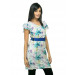 White printed knee-length dress made of woven 100% rayon, has short ruffled sleeves, a round neck, small pleats from the neckline and two pockets on the sides