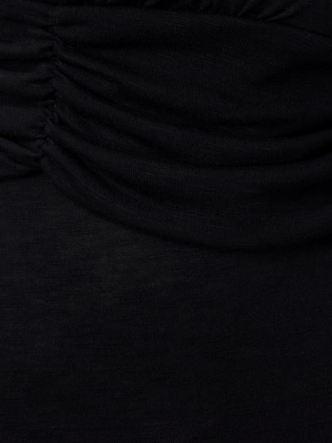 Knitted black strapless dress with bra padding and elastication for a comfortable Fit, empire line and a panel below it with elasticated gathers