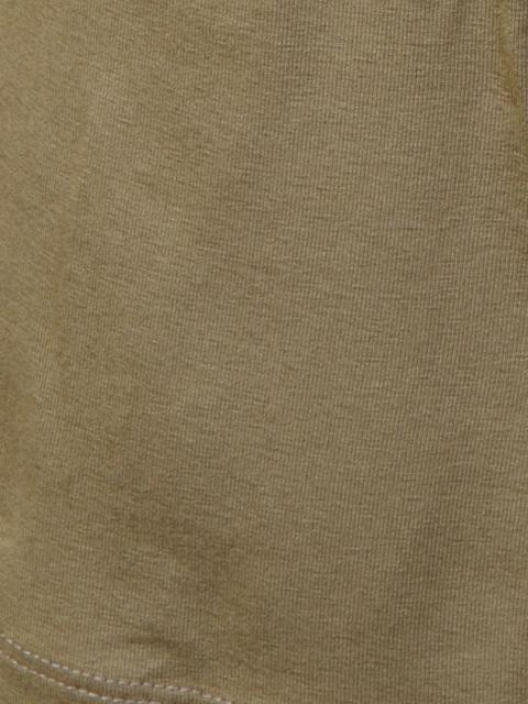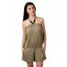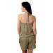Brown playsuit with two detachable beaded strings in the middle to tie around the neck, elasticated above the bustline for a snug Fit, elasticated below the waistline with gathers at the waist, shorts below with curved pockets on either side below the waist